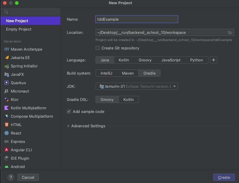 Build system을 Gradle로 설정하고 새로운 프로젝트를 생성한다.