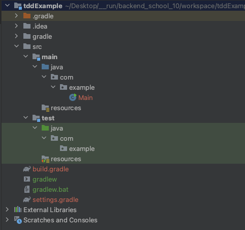 test/java/com/example에 CalculatorTest 클래스를 생성하고 아래와 같은 코드를 작성한다
