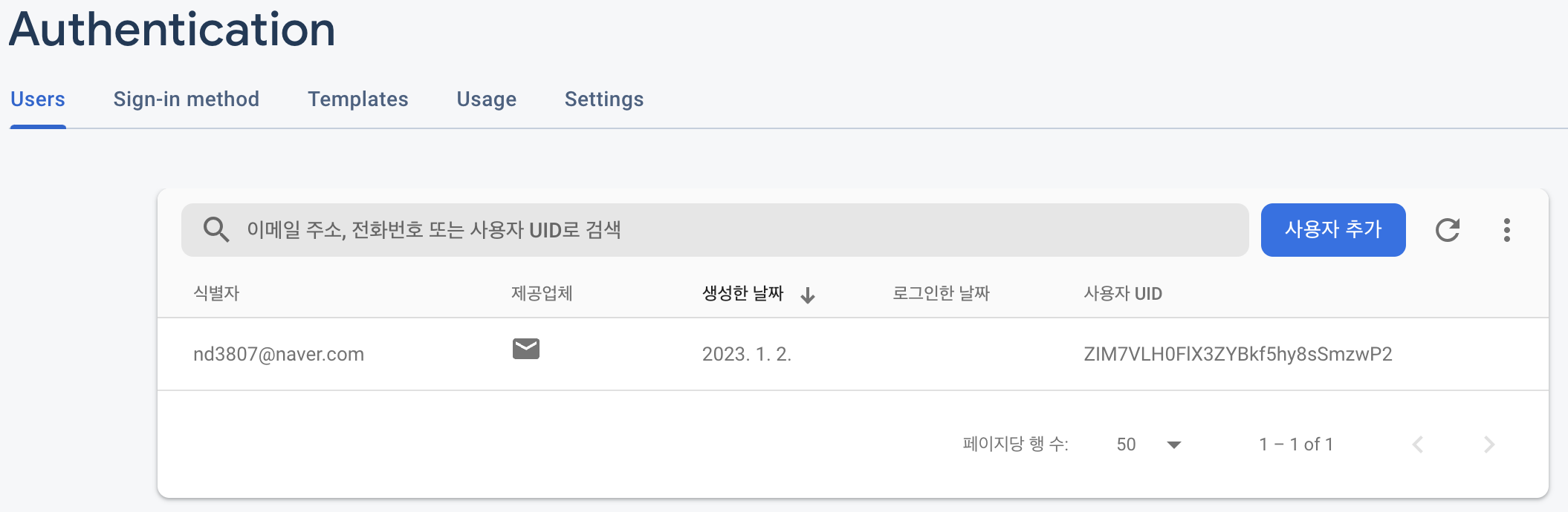 (1) Authentication - Users에서 사용자 추가 버튼 클릭하여 이메일과 비밀번호를 입력 후 사용자를 추가한다.