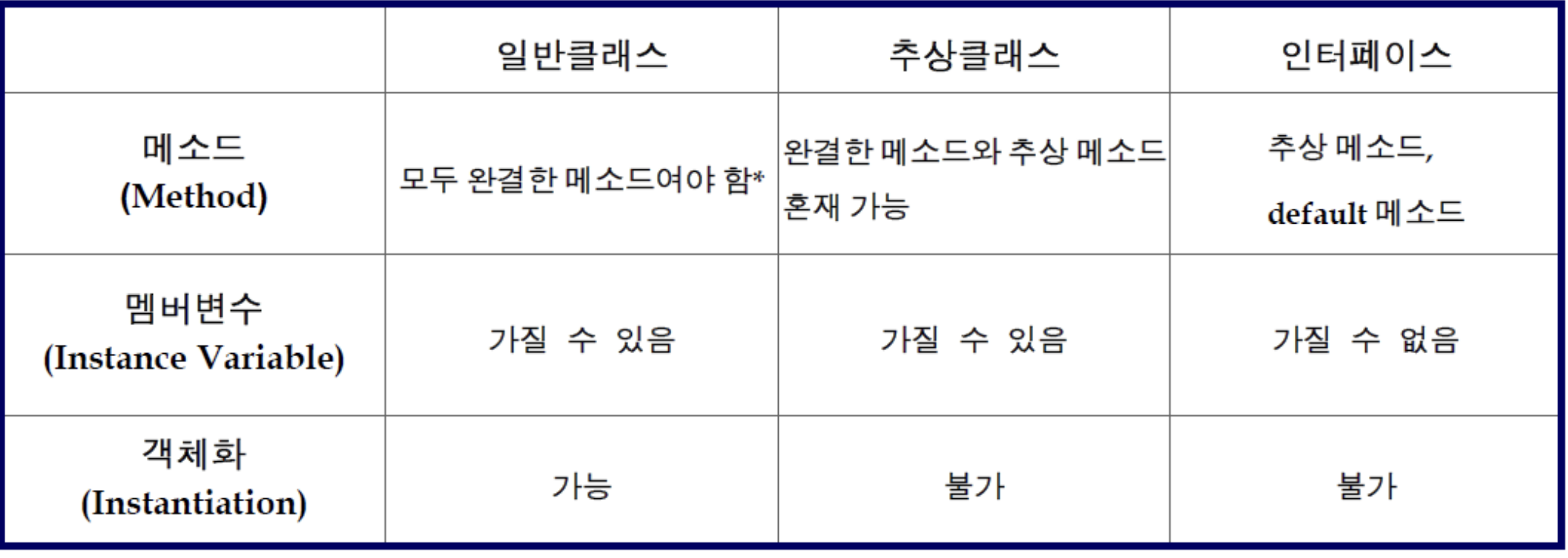 - 한 클래스는 하나의 부모클래스를 가지며 하나 이상의 인터페이스를 구현할 수 있음